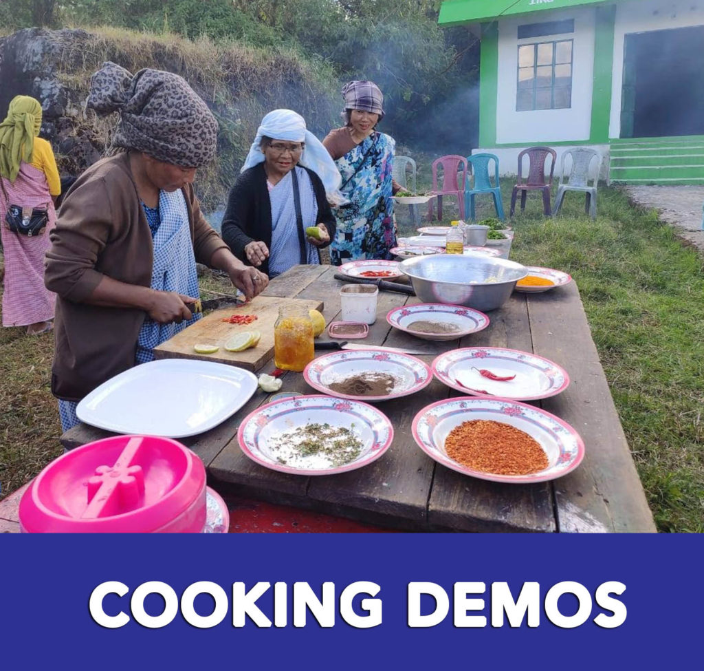 NESFAS aspires that every community eats clean food which is locally available in their traditional food system. To this end, NESFAS implements an ongoing campaign to enhance diversity of food on the plate. The framework of food diversity that NESFAS has adopted is the FAO Minimum Dietary Diversity. As part of the campaign, various activities are conducted in schools, home visits are conducted and community programme are organised where communities engage to express themselves in the form of dance, song or traditional couplets called Phawar. As part of the nutritional campaigns, ABD Walks are conducted mostly with children and through these walks, wild plants are documented and catalogued. Cooking demonstrations are also conducted with mothers, ASHA and Aganwadi workers, and youth. The aim is to remind people of the simple ways in which local food can be cooked in a tasty and nutritious manner.